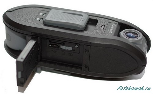 На левой поверхности, под откидывающейся крышкой, располагаются разъем под micro-SD карту памяти (распознает карты до 32 Гб), переключатель режима съемки (вертикально/горизонтально сшивать синхронизированное видео), таинственная кнопка “Cтатус”, микро-USB разъем для подключения камеры к ПК и зарядки аккумулятора.