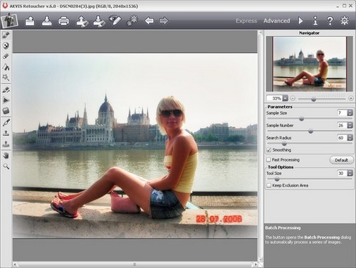 - Добавлена поддержка пакетной обработки файлов, что позволяет в автоматическом режиме отретушировать большое количество изображений. Данная возможность полезна для обработки фотографий, имеющих сходные дефекты или одни и те же элементы для удаления (например, пятна или царапины, дата создания снимка).