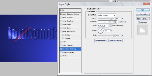 на панели слоев. С помощью стиля Gradient Overlay будем создавать наш блик. Выбираем режим наложения Color Dodge, Прозрачность – 80%, Градиент – от белого к прозрачному, стиль – Reflected, угол – 60%. Если переместить диалоговое окошко в сторону, можно увидеть на картинке блик. Не закрывая стили слоя уберем блик из поля видимости. Для этого берем инструмент Move
