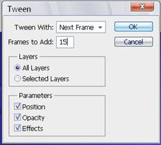В окне анимации создаем промежуточные кадры: