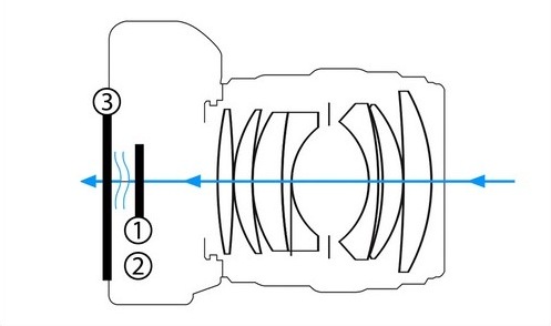 Итак, в конструкции беззеркального фотоаппарата нет зеркала и каких-либо сопряженных устройств. Если в зеркальном фотоаппарате свет, проходящий через систему линз в объективе, попадает на зеркало с пентапризмой, то в «беззеркалке» световой поток сразу же направляется на светочувствительный элемент (1). Предварительный просмотр изображения осуществляется не с помощью оптического видоискателя, а за счет считывания изображения процессором (2) непосредственно с матрицы фотоаппарата. Визирование происходит при помощи электронного видоискателя (3), в роли которого выступает ЖК-дисплей, поддерживающий режим LiveView. Нужно отметить, что у идеи отказаться от самого принципа работы зеркального фотоаппарата, удалив из корпуса устройство с зеркалом, есть как свои плюсы, так и минусы.