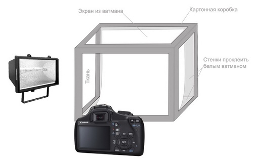 - На последнем этапе Вам нужно будет установить светильник над верхней частью коробки таким образом, чтобы объект съемки оказался равномерно освещен со всех сторон. Ваш фотобокс для предметной съемки готов к работе. Для изменения светового рисунка можно использовать несколько осветительных приборов или изменять ил положение.