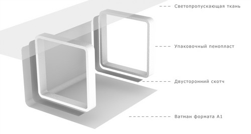 Суть данного варианта изготовления лайтбокса заключается в том, чтобы склеить упаковочный пенопласт с ватманом. На ватман устанавливается упаковочный пенопласт и склеивается с ним посредством простого скотча. В ходе склейки мы создаем достаточно крепкую конструкцию, в которой плотность ватмана и легкость пенопласта обеспечивают жесткость платформы и в то же время возможность удобной переноски будущего фотобокса.