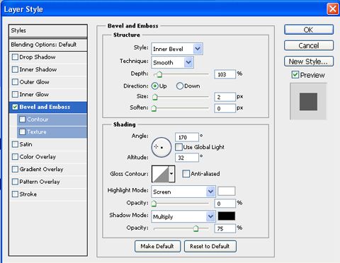 . Здесь нам понадобится стиль «Скос и Тиснение» (Bevel and Emboss):