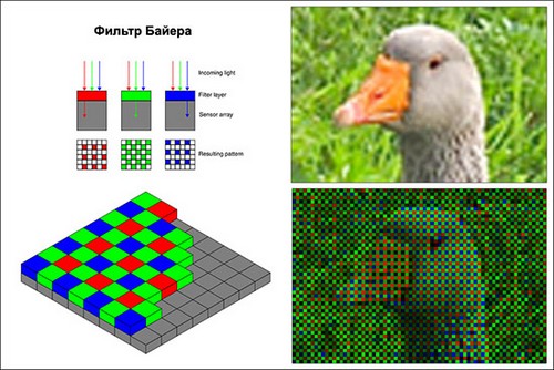 Как хорошо известно, любой цвет в спектре можно получить путем смешения всего нескольких основных цветов (красного, зеленого и синего). Распределение светофильтров по поверхности сенсора для формирования цветного изображения может быть разным, в зависимости от выбранного алгоритма. В большинстве цифровых фотоаппаратов сегодня применяется цветовая модель Байера (Bayerpattern).