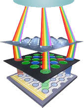 Для того, чтобы сенсор цифрового фотоаппарата мог различать цветовые оттенки, над его поверхностью устанавливают блок микроскопических светофильтров. Если в матрице используются микролинзы, служащие для дополнительной фокусировки света на пикселях с целью повышения их чувствительности, то фильтры размещаются между каждой микролинзой и ячейкой.