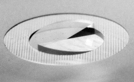 Такой экран основывается на следующем принципе: картинка, находящаяся не в фокусе зрительно разбивается вдоль вертикальной или горизонтальной оси, она сводится в единое целое, когда снимаемый объект расположен в фокусе. В данном случае область фокусировки представляет собой окружность в центре матового стекла, которая разделяется линией на две части. Объект, находящийся в зоне клиньев, всегда будет выглядеть резким в кадре. Если же фокусировка произведена неправильно, то линии предмета съемки, пересекающие линию клина, становятся разорванными. Клинья Додена могут быть диагональными, вертикальными или горизонтальными.