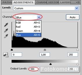 На панели RGB, выбираем канал Синий и увеличиваем значение опции (Output Levels) до 150.