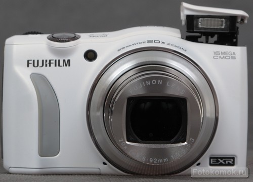 Вспышка у этой серии фотоаппаратов вынесена на самый край верхней грани. В предыдущих моделях серии наблюдался забавный недостаток, когда держишь камеру двумя руками, вспышка постоянно пыталась выскочить и боднуть палец. В конструкции FujiFilm F770EXR предусмотрена кнопка, отвечающая за подъем вспышки, поэтому вспышка самопроизвольно больше не выскакивает.