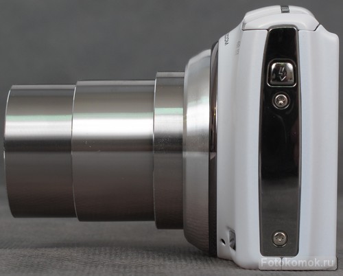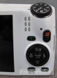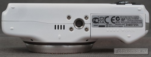 На верхней плоскости камеры расположены кнопки включения-выключения фотоаппарата и кнопка съемки, совмещенная с кольцом зуммирования.