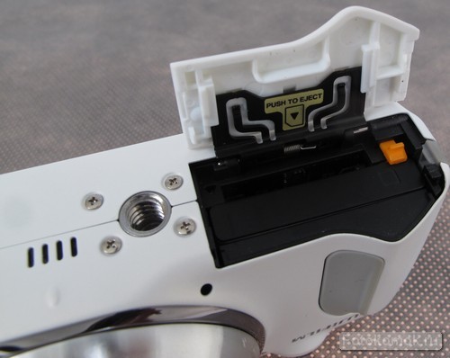 Карта памяти и аккумуляторная батарея расположены под одной крышкой. Аккумулятор имеет зубчик на корпусе, поэтому если вы вставляете его в фотоаппарат неправильно, желтый рычажок предохраняющий аккумулятор от выпадения просто не защелкнется.