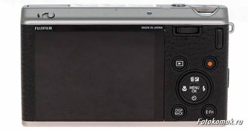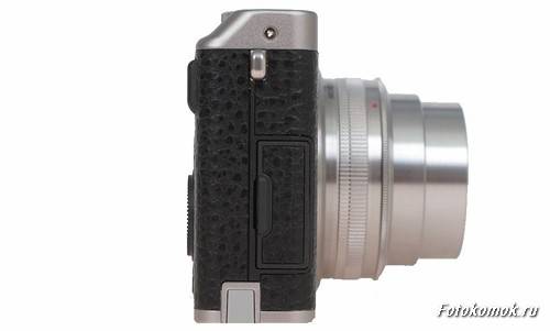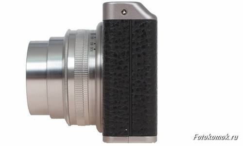 На передней панели новинки мы видим подсветку автофокуса и собственно объектив. Как уже говорилось выше зум-объектив имеет диапазон фокусных расстояний 25-100 мм (у FujiFilm X10 28-112 мм ) в 35 мм эквиваленте с диафрагмой F1.8 на широком угле и 4,9 на телефото (у модели X10 2.0-2.8). Как видно объектив у новинки несколько проще, чем у предшественника, но широкий угол, встроенный стабилизатор и высокая светосила делают фотокамеру отличным инструментом для съемки при низкой освещенности, незаменимой в помещении.