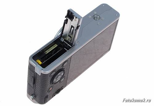 На нижней панели видим крепление под штатив и крышку, прикрывающую отсек, в котором находятся аккумулятор и разъем для карт памяти SD.