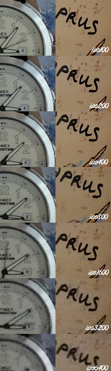 Как видно из тестовых снимков, значения ISO до 800 включительно являются полностью рабочими, при ISO1600 шумы становятся ощутимыми, а при значениях ISO3200 и выше шумы вносят существенные искажения в получаемые изображения.