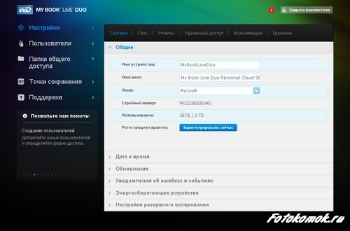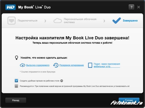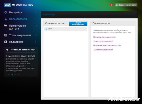 После установки программного обеспечения можно провести более тонкую настройку Western Digital Book Live DUO – определить, кто будет иметь доступ к этому диску, назначить папки для общего доступа, настроить резервное копирование данных.