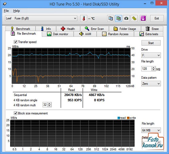 Модель Leef Fuse явно рассчитана для работы с USB 2.0, т.к. при подключении ее к USB 3.0 данные по скорости чтения/записи файлов не меняются, чтение – около 20,5 Мб/с, запись 4,5 Мб/c.