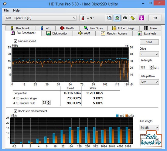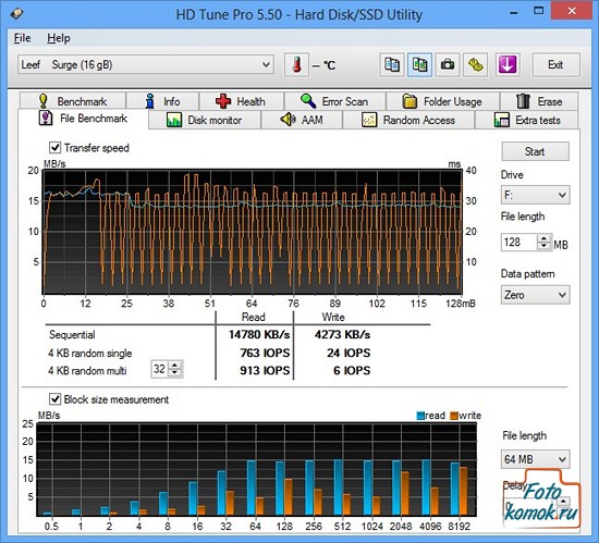 Результаты теста USB-накопителя Leef Surge 16 Гб (Все накопители тестировались программой HD Tune Pro 5.5, на компьютере следующей конфигурации Intel Core i3-3227U/6ГБ RAM/256ГБ SSD/Win8 64-bit, подключением к разъемам USB 2.0 и USB 3.0)