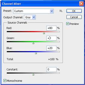 Дублируем фоновый слой (Ctrl+J) и заходим в Смеситель каналов (Image=> Adjustment=> Channel Mixer). В открывшемся окне устанавливаем приблизительно такие настройки: