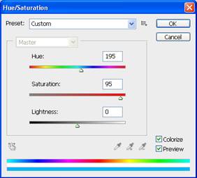 Далее, идём в Тон/ Насыщенность (Image=> Adjustment=> Hue/Saturation) и ставим следующие настройки: