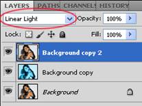 Дублируем первый слой, перемещаем новый слой поверх остальных и меняем режим наложения на Linear light: