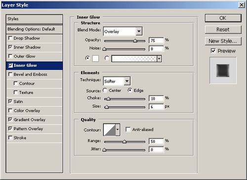 Теперь приступим к непосредственному “разогреву” текста. Щелкнем правой кнопкой мышки по слою с текстом и рамкой, выберем Blending Options и последовательно выполним настройки по картинкам.
