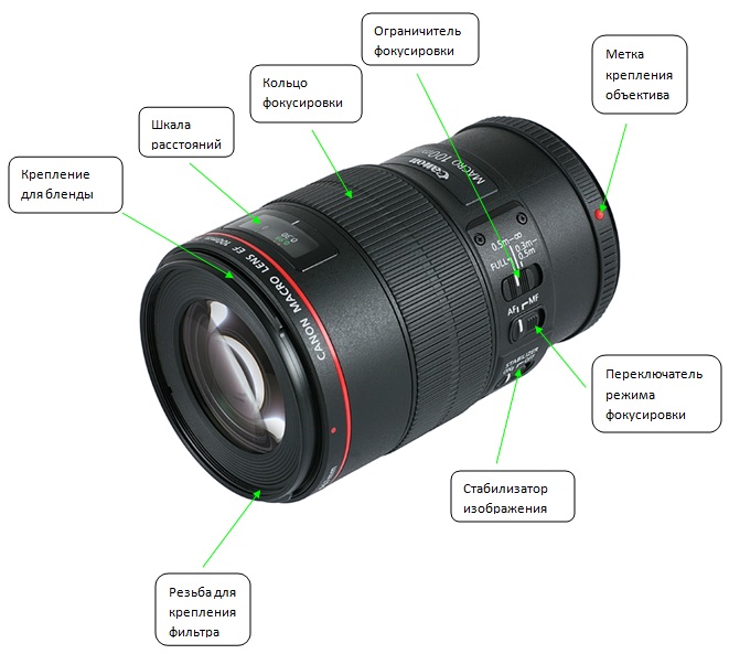 Объектив является сложным оптическим устройством, которое конструктивно состоит из следующих основных элементов: системы линз и сферических зеркал, изготовленных из специального оптического стекла, металлической оправы и диафрагмы. В лицевой части объектива располагается оптическая линза, основное предназначение которой состоит в сборе световых лучей. Внутри объектива размешаются уже другие оптические линзы и сферические зеркала, которые отвечают за последующее преломление света и дальнейшее формирование изображения.