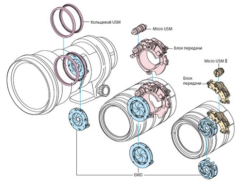В современных объективах ведущих производителей применяется ультразвуковой привод фокусировки (USM), встроенный непосредственно в объектив. Благодаря ему обеспечивается очень быстрая скорость работы фокусировки. Существуют объективы и с так называемым отверточным приводом, который механически связывает объектив и фотоаппарат. Такая система работает более медленно и шумно.